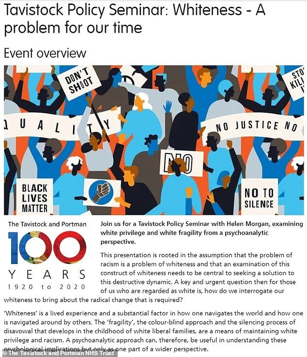 One of the Tavistock's seminars was called 'Whiteness – a problem for our time' and included a description on the Trust's website that 'the problem of racism is a problem of whiteness' (pictured)